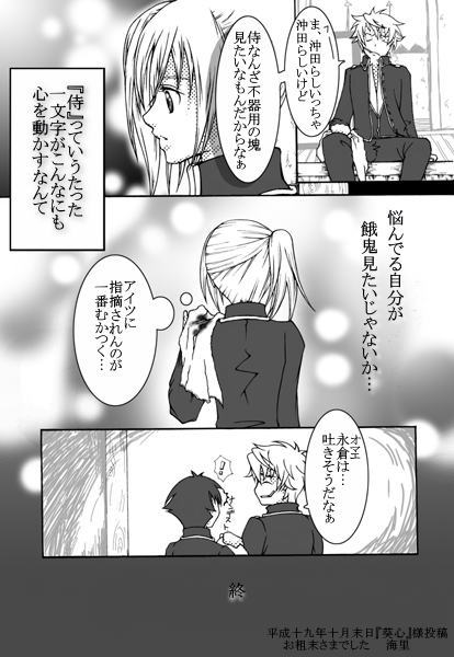 「贖罪」 ![]() 無駄にあとがきなんかを書いてみる 初期祭り『葵心』さまに投稿した漫画です。 この時期の雨はものすごく冷たいのに、かかる血しぶきの暖かさが気持ち悪くて、 そんなことを表現したかったんですが…自分の力不足でした。 この時点でまだ永倉は人を斬ったことがない甘ちゃんです。 それぞれがそれぞれに何らかの贖罪を抱え込んでると萌えますねっ! 自分の中ではトーンとか使って初めて描いた漫画でした。 背景の書き忘れとかを無駄にPCで書いたりとか…。 漫画の下書き自体はお祭りに参加するぞ!って決めたときから書き始めたのに 蓋を開けたら10月ギリギリまでやってるおばかさんがここにいますしね! ともかく5Pという狭い範囲の中での精一杯でした。 お粗末さまでした(深々)。 |