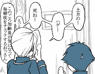 | おめーらの方が魔王だろうがぁぁぁ!!! 加島さんがうちの山崎を書いてくれました!! 大人で可愛い山崎がいます。加島さんちはこちら! で、何が可愛い人かと言うと、山崎から見た全員。 「沖田が割った土方の湯飲み茶碗を埋める山崎を 永倉が見かけるんですが、沖田は沖田で それを申し訳なく思ってわざと逃がすように差し向ける。 永倉は自分を気にして様子を伺いに来てくれるし 土方はなんとなくそれを察して逃がすように差し向けてる。」 (↑加島さんの小説を見て広がった妄想ワールド) だから全員可愛い人。 でも、本音を少しだけ言わせてもらえると… 最後のコマがただ描きたかっただけなんだ! |